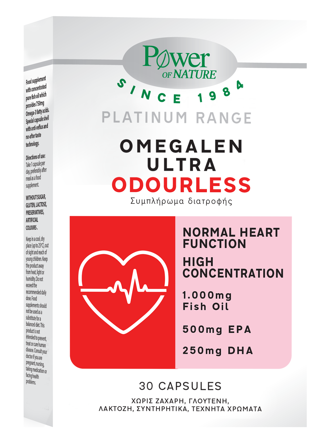 Рибено масло с изключително висока чистота и концентрация на Омега-3 мастни киселини, без характерната миризма на риба и без съдържание на тежки метали. Всяка капсула съдържа 1000 mg рибено масло, добито чрез молекулярна дестилация и студено пресоване, което осигурява 750 mg Омега-3 ненаситени мастни киселини, от които 500 mg EPA (ейкозапентаенова киселина) и 250 mg DHA (докозахексаенова киселина). DHA и EPA допринасят за нормалното функциониране на сърцето. DHA допринася за нормалното функциониране на мозъка и поддържането на нормално зрение. Замяната на наситени мазнини с ненаситени мазнини в диетата помага за поддържане на нормални нива на холестерол в кръвта. Приемът на докозахексаенова киселина (DHA) от майката допринася за нормалното развитие на мозъка и очите на плода и кърменото бебе. Витамин E допринася за защита на клетките от оксидативен стрес.